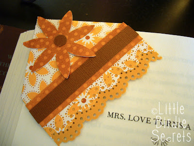 This one was made by Jennifer at Lasting Memories. It was on the corner of a thank you card as a little gift--such a cute idea! It's simply a rectangular piece of patterned paper with the points of the long end folded to the middle to meet each other, with a triangle of coordinating paper holding them in place on back. Then she embellished with strips of card stock and a few paper punches.