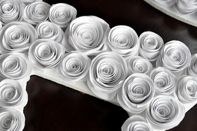 3. Start gluing your roses to your letters. I laid out a few at a time to make sure they were going to fit well. Don't be afraid to smoosh them in close together. It's just paper--you won't ruin the flowers.